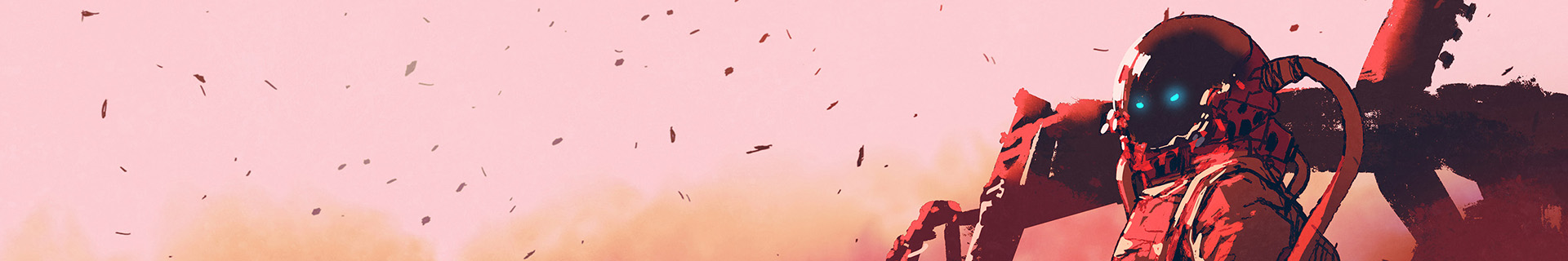 An astronaut with sinister glowing blue eyes standing in front of a lunar buggy both coloured red with debris flying behind them.