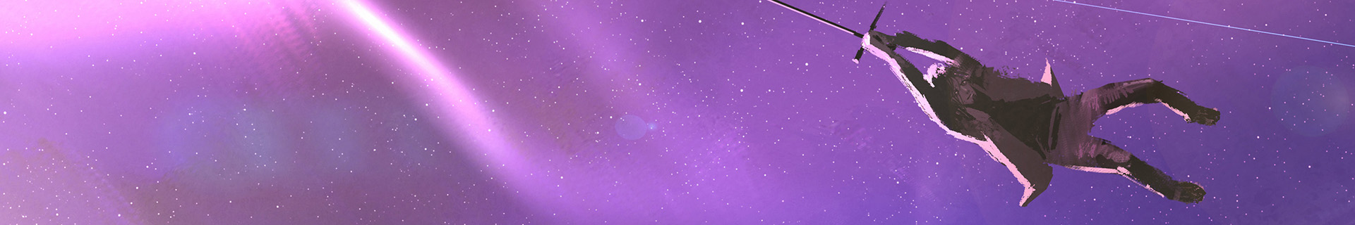 A figure hanging on to a rope, being pulled, all in front of a strong purple starry background.